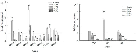 In the Tc-Ha group, the expression levels of all five TRE1 genes were downregulated, of which the expression levels of TRE1-1 and TRE1-4 genes were significantly downregulated (p < 0.01), and on the contrary, the expression levels of TRE1-3, TRE2-like and TRE2-2 genes were significantly upregulated compared with the control group (p < 0.01) (Figure 6a).