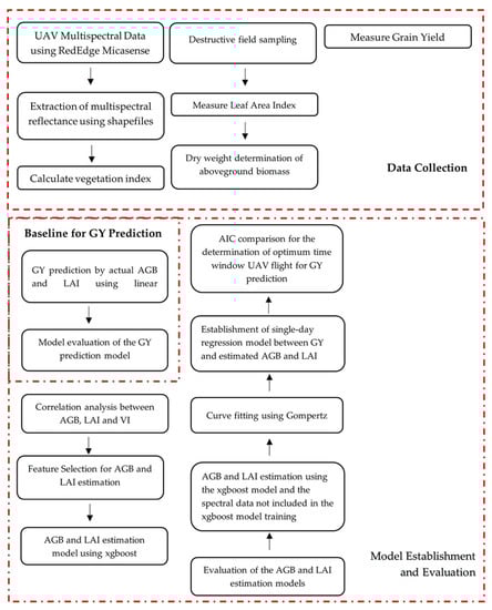 The workflow of the study consisted of the following: (1) data collection and processing of AGB, LAI, grain yield, and UAV spectral data for the years 2020 and 2021, (2) establishment of baseline grain yield prediction, and (3) estimation models for AGB and LAI to be used as predictors for the GY prediction model. The details are described in Figure 1.