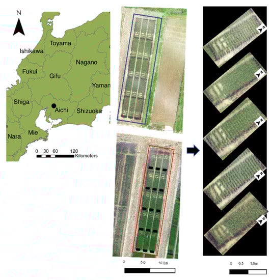 Location of the study site in Aichi, Japan. Orthomosaic image of the two experimental trials: trial with no fertilizer (in blue box) and trial with fertilizer (red box). On the right, from the top to bottom, are the plot images clipped from the orthomosaic image of rice cultivars, namely, Aichinokaori, Hatsushimo, Asahi, Nakate Shinsenbon, and Nikomaru.