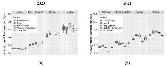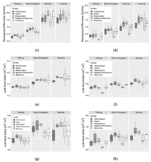 The range of LAI values per growth stage was similar among cultivars in the fertilizer trial except with Aichinokaori in 2020 and Nakate Shinsenbon in 2021 (Figure 3e,f). Higher LAI values were observed among cultivars in 2020 than in 2021. LAI measured from the fertilizer trial was also higher than in the trial with no fertilizer. Higher LAI variability within a cultivar was also observed in the fertilizer trial, especially at later growth stages (Figure 3g,h).