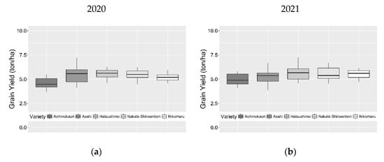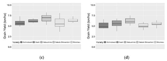 Grain yields across cultivars showed slight variation in the trial with no fertilizer compared to grain yields in the fertilizer trial. In 2020, Aichinokaori had a lower grain yield than Hatsushimo and Nikomaru, while in 2021, Hatsushimo had a higher grain yield than Nakate Shinsenbon. Aichinokaori had the lowest grain yield across trials and years (Figure 4a–d).