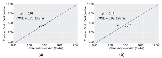 However, incorporating these parameters did not always result in better prediction. In particular, the inclusion of growing degree-days did not improve the model compared to using the NDVI alone [26]. Rice prediction models use a generalized optimal sensing time and multi-temporal Vis to predict grain yield, and their performances depend on the accuracy of monitoring certain rice growth stages that are known to be important in grain yield determination such as panicle initiation and flowering stages. Sensing beyond panicle differentiation resulted in a lower rice grain yield prediction than during the interval between panicle initiation and differentiation [22,26].
