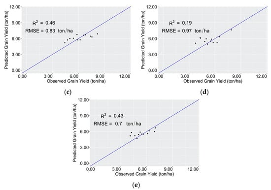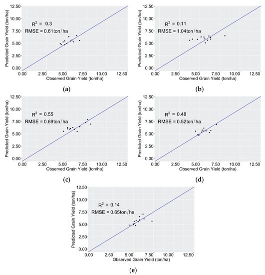 The independent test dataset evaluated the prediction models corresponding to the optimum time windows (Figure 13a–e). The results show that prediction models corresponding to the optimum time window for cultivars Asahi and Nikomaru did not generalize well on the unseen dataset in R2. The grain yield prediction model for Nakate Shinsenbon performed better than the previous two cultivars (RMSE = 0.52 ton/ha). Conversely, a prediction model for cultivar Hatsushimo showed a better performance compared to the other cultivars. The prediction model for Aichinokaori at a later optimum time window showed a good prediction performance (RMSE = 0.61 ton/ha). Asahi was found to have a higher RMSE in the independent test dataset, and the prediction error (RMSE = 1.04 ton/ha) was two times higher than the prediction error of the other cultivars.