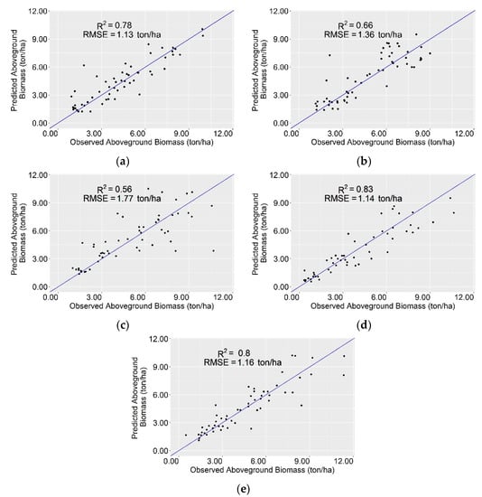 Model evaluation of AGB estimation model using the test dataset for cultivars (a) Aichinokaori, (b) Asahi, (c) Hatsushimo, (d) Nakate Shinsenbon, and (e) Nikomaru.