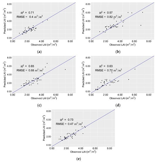 Model evaluation of LAI estimation model using the test dataset for cultivars (a) Aichinokaori, (b) Asahi, (c) Hatsushimo, (d) Nakate Shinsenbon, and (e) Nikomaru.