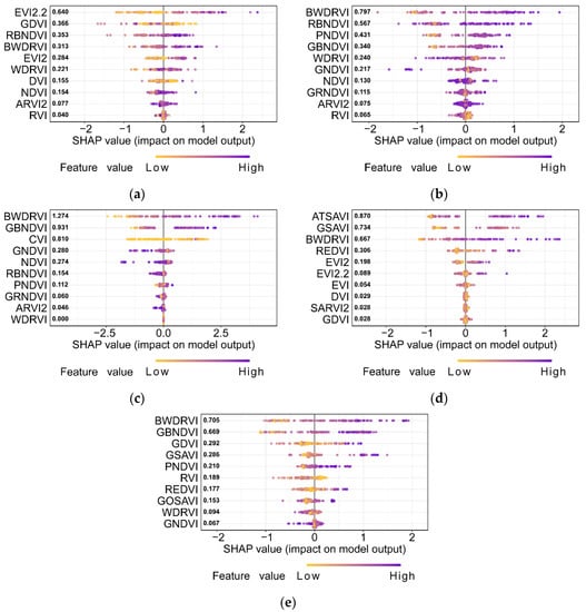 Comparing the levels of correlation of VIs to the levels of importance in the XGBoost model showed a difference in trend. There were VIs with a medium correlation with AGB, but they showed the highest level of importance in the XGBoost model. In particular, the variable importance of the AGB estimation model for Aichinokaori showed that EVI2.2 was the essential feature in the prediction (Figure 8a). Likewise, the variable importance of the AGB estimation model for Nakate Shinsenbon showed that ATSAVI was the most crucial feature in the prediction model (Figure 8d) but was the least correlated VI with AGB among the ten VIs (Table A2) used in the training process. However, this difference in feature ranking was compensated by making the most correlated VIs the second most important feature in XGBoost, as seen in the variable importance of the AGB estimation models for Asahi, Hatsushimo, and Nikomaru. Nevertheless, the variable importance of the AGB estimation models for other cultivars such as Asahi, Hatsushimo, and Nikomaru showed that BWDRVI was the essential feature, which was also the VI most correlated with AGB (Table A2). The SHAP values of the AGB estimation models show that at least four feature variables per estimation model did not influence the prediction.