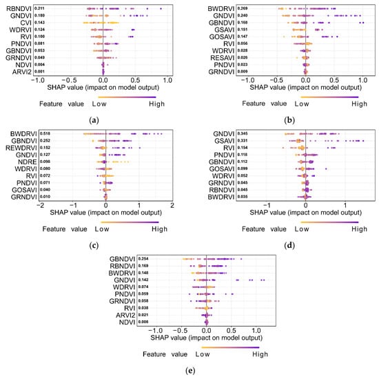 The variable importance in the LAI estimation model for each cultivar is shown in Figure 9a–e. The topmost vital features in the training process of the LAI estimation models were the VIs in the middle in the order of ascending correlation with LAI. The least correlated VIs also ranked the lowest in variable importance, such as GRNDVI in the estimation model for Hatsushimo and NDVI in the estimation model for Nikomaru. Similar to the AGB estimation models, the most correlated VIs were the second most important feature in the variable importance for the LAI estimation model.