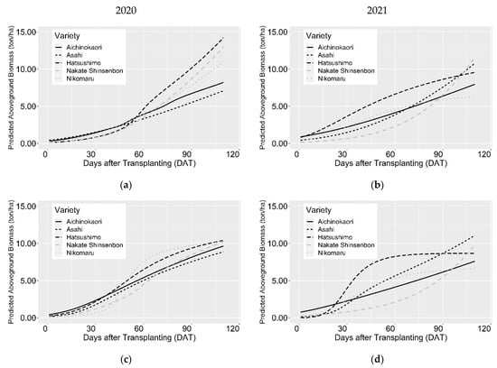 Estimated aboveground biomass (ton/ha) of five cultivars grown in 2020 and 2021 in the trial with no fertilizer (a,b) and trial with fertilizer (c,d).