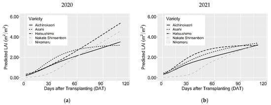 Aerial photography by UAV flights was conducted once per week until heading, and by using the reflectance data and the estimation model described above, it is possible to estimate changes in AGB and LAI for each rice cultivar over the growing season. The estimated AGB and LAI of each flight day were fitted to the Gompertz growth curve (Figure 10 and Figure 11). Although the pattern of growth varied by year and fertilizer conditions, the relative growth trends for each cultivar were common. In our study, Hatsushimo was the fastest growing cultivar, with relatively high AGB and LAI at 85 DAT. At the same time, Nikomaru was the slowest growing cultivar, with a low AGB and LAI at the early growth stage. To evaluate the accuracy of the estimation and curve fitting, the estimated AGB and LAI values for each cultivar, year, and trial were compared to the actual values of AGB at the heading stage and LAI at the booting stage. Based on this comparison, the highest accuracy for AGB estimation was observed in Nikomaru, while the lowest accuracy was observed in Asahi. The estimation for LAI across years and trials showed that the highest accuracy was observed in Asahi, and the lowest accuracy was observed in Hatsushimo (data not shown).