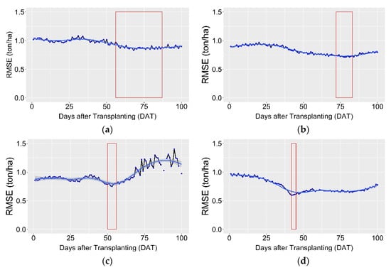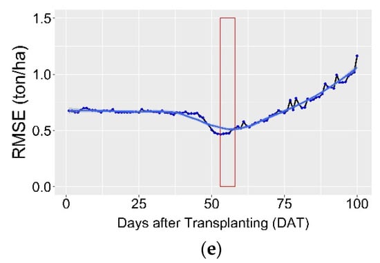 RMSE result of the training dataset of the single-day regression model between grain yield and VI-estimated AGB and LAI of the five rice cultivars. The red box indicates the optimum time window for UAV flights as determined from the AIC score comparison. The black line indicates the mean R2 values from the repeated k-fold cross-validation conducted for each single-day regression. The darker blue line indicates the smoothed R2 values that can be expected from the plotted R2 series derived from the repeated k-fold cross-validation. The smoothed R2 values were determined by using the LOESS (locally weighted scatterplot smoothing) method. The lighter blue region indicates the range of smoothed R2 values to be expected 95% of the time from each single-day regression. (a) Aichinokaori; (b) Asahi; (c) Hatsushimo; (d) Nakate Shinsenbon; (e) Nikomaru.