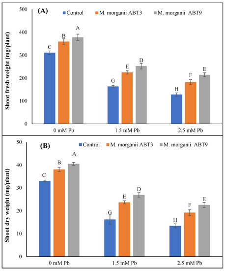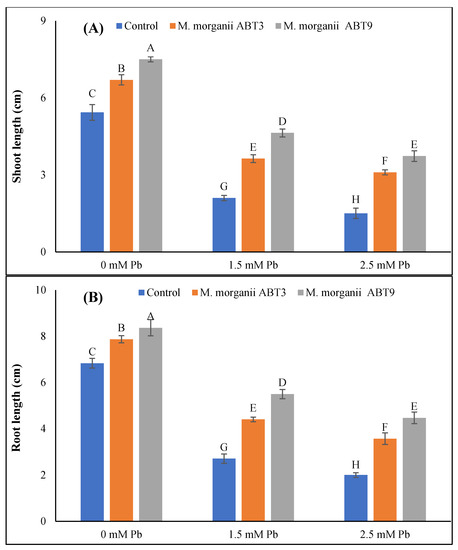 Shoot and root length of Arabidopsis significantly decreased due to Pb contamination compared to control plants without inoculation, while improvement in both shoot and root length was observed under all Pb stress by the inoculation of Pb-resistant M. morganii strains (ABT3 and ABT9) in Pb-contaminated soil (Figure 3). Results showed that Pb-resistant rhizobacteria (ABT9) promoted shoot and root length by 148.88 and 123.33%, respectively, compared to Arabidopsis plants grown in 2.5 mM lead-contaminated soil without inoculation.