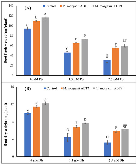 Similarly, Pb contamination significantly reduced the root fresh and dry weight compared to control uninoculated Arabidopsis plants (Figure 2). The decrease in the root fresh and dry weight increased with increasing Pb concentrations. Maximum reduction in root fresh and dry weight of Arabidopsis plants was observed at 2.5 mM Pb stress compared to uninoculated controls. Results showed that 67.31 and 67.28% decreases, respectively, were observed in root fresh and dry weight at 2.5 mM Pb contamination compared to control plants without inoculation. However, the inoculation of Pb-resistant M. morganii strains (ABT3 and ABT9) improved the root fresh and dry weight at both Pb levels. Pb-resistant rhizobacteria (ABT9) increased the root fresh and dry weight by 94.04 and 93.92%, respectively, compared to Arabidopsis plants grown at 2.5 mM lead contamination without inoculation.