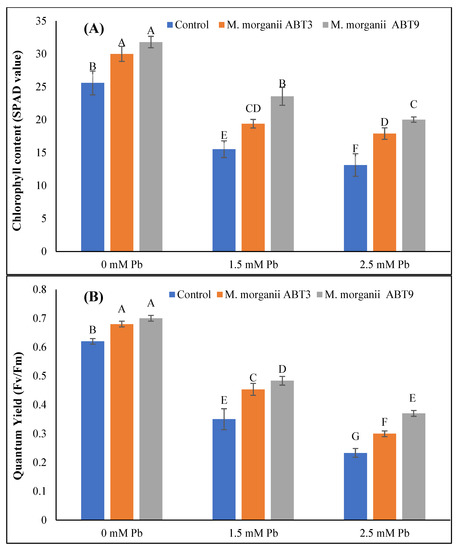 Further, the efficacy of Pb-resistant strains M. morganii strains (ABT3 and ABT9) on photosynthetic efficiency of Arabidopsis plants was observed in terms of quantum yield (Fv/Fm) and chlorophyll content. Results showed that Pb stress significantly reduced chlorophyll content and Fv/Fm, while inoculation with Pb-resistant M. morganii strains (ABT3 and ABT9) promoted these parameters significantly (Figure 4). The highest Pb concentration (2.5 mM) caused a more severe decrease in chlorophyll content (by 48.69%) and Fv/Fm (by 62.36%) compared to that in control plants without inoculation. Pb-resistant rhizobacteria (ABT9) yielded a maximum increase in chlorophyll content and Fv/Fm by 52.53% and 58.57%, respectively, compared to Arabidopsis plants grown under 2.5 mM lead contamination without inoculation.