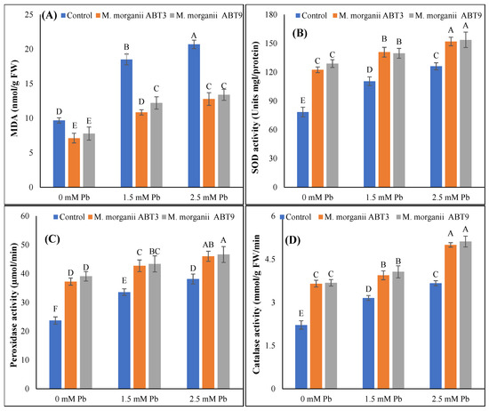 An increase in lipid peroxidation and antioxidant enzyme activities (SOD, POD and CAT) was observed with increasing Pb concentration compared to non-stressed un-inoculated Arabidopsis plants (Figure 5). Maximum increases in lipid peroxidation, SOD, POD and CAT, by 113.8, 60.88, 60.54, and 65.30%, respectively, were observed at the 2.5 mM Pb concentration compared to control plants without inoculation. Inoculation with Pb-resistant M. morganii strains (ABT3 and ABT9) significantly decreased lipid peroxidation while causing considerable increases in SOD, POD and CAT enzyme activities in PGPR-inoculated Pb-stressed Arabidopsis plants. At 1.5 mM Pb stress, both strains reduced lipid peroxidation by 41.42 and 34.01%, respectively, while at 2.5 mM Pb stress, decreases of 38.24 and 35.28%, respectively, were observed. At both Pb concentrations, the maximum improvements in SOD (26.36 and 21.84%, respectively), POD (29.25 and 22.34%, respectively) and CAT (28.80 and 39.46%, respectively) activities were observed in ABT9 strain-inoculated Arabidopsis plants compared to plants grown under 1.5 mM and 2.5 mM lead contamination without inoculation.