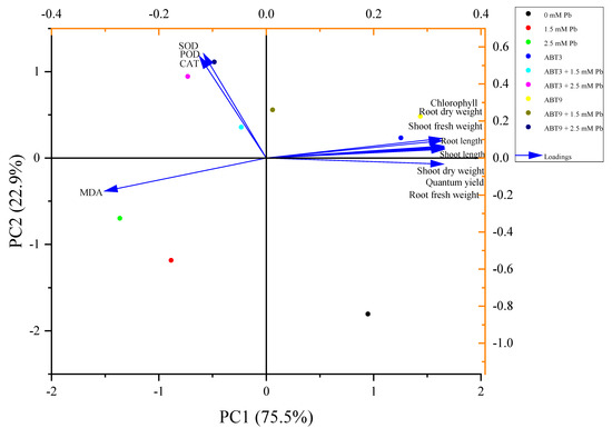 The PCA analysis showed the phytoremediation potential of treatments with Pb-resistant rhizobacterial strains ABT3 and ABT9 on Arabidopsis plants under Pb contamination. All nine treatments scattered differently across the PC1 and PC2, indicating the efficiency of Pb-resistant strains. PC1 showed 75.5% data variance, while PC2 showed 22.9% data variance (Table 1).