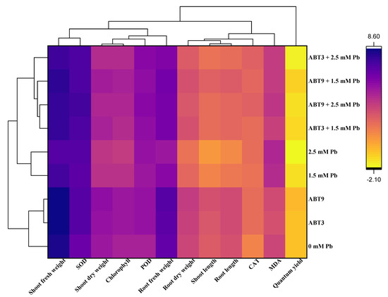 In the heatmap, it was observed that the treatments with Pb-resistant strains (ABT3 and ABT9) were positively correlated with the growth parameters, quantum yield, chlorophyll content and antioxidant activities of Arabidopsis seedlings (Figure 7), and these treatments were more isolated compared to all other treatments, thus indicating remarkable differences in inoculated and uninoculated Arabidopsis plants.