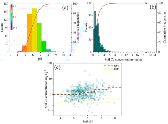 Cumulative frequencies of soil pH (a) and soil Cd concentration (b), scatter plots of soil pH and soil Cd concentration (c). RSV (yellow line in Figure 2c) represents the risk screening values for soil contamination of agricultural land in the China RIV (red line in Figure 2c) and represents risk intervention values for soil contamination of agricultural land in China.
