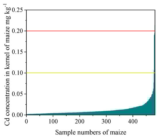 The relationship between the Cd concentration in maize kernels and sample numbers of maize. The yellow line represents the limit of light Cd contamination in maize kernels (0.1 mg kg−1) as recommended by national standards. The red line represents the limit of heavy Cd contamination in maize kernels (0.2 mg kg−1) as recommended by national standards.