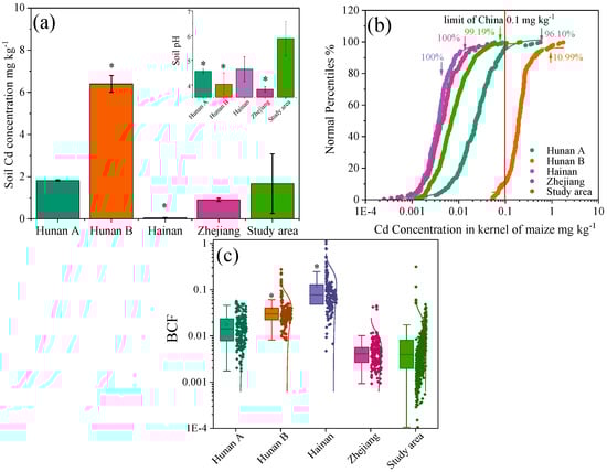 Soil Cd concentration and soil pH value (a), Cd concentration of kernels in the form of a cumulative distribution function (b), bioaccumulation factor of Cd (c) in the study area and a maize field in Hunan, Zhejiang, and Hainan Provinces, China. * indicates a significant difference between the data in the reference area and the data in the study area (Duncan’s test) (p < 0.05).