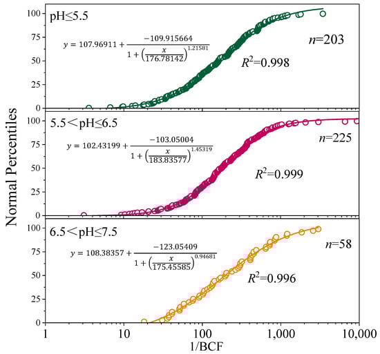From the above results, it can be concluded that the current Chinese standard was not suitable for evaluating the soil Cd pollution level in the study area (Table 1), and the soil environmental quality benchmarks need to be proposed according to the actual situation. Thus, we utilized the species sensitivity distribution method to calculate the 5% and 95% hazardous concentrations in maize fields to assess the actual Cd pollution level of the research region []. Specifically, the logistic distribution model and the standard limit of Cd for maize kernels according to the national standard were used to fit the 1/BCF value and the cumulative probability of maize kernel Cd. Equations (2)–(4) were used to calculate the hazardous concentration based on 95% and 5% crop safety (HC5 and HC95) for soil pH ≤ 5.5, 5.5 < pH ≤ 6.5, and 6.5 < pH ≤ 7.5 (the number of soil points under pH > 7.5 was insufficient). The results are shown in Figure 5.