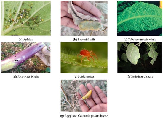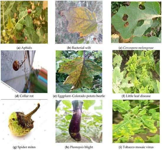 Eggplant (Solanum melongena) is a popular vegetable crop. Plant health is important for the yield of nutrient-rich eggplants. However, eggplant plants and crops can be attacked by various diseases and pests, such as Cercospora melangenae, bacterial wilt, aphids, anthracnose fruit rot, Alternaria rot, collar rot, damping off, phytophthora blight, Phomopsis blight and fruit rot, leaf spot, and mosaic [1]. Despite continuous efforts to combat diseases in different ways, e.g., disease-tolerant varieties and targeted pest and disease control using selective chemicals, many diseases cause significant crop losses.