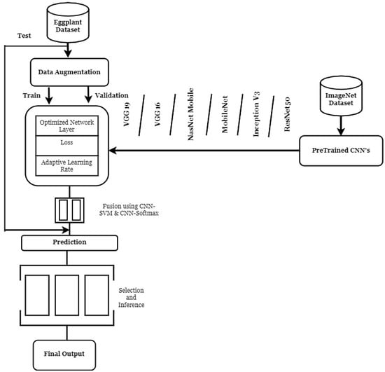 In this section, we propose the two stream deep fusion architecture for the classification of eggplant diseases. The first stream is called feature extraction by deep CNN with transfer learning (Inception V3, VGG16, VGG19, ResNet50, MobileNet, and NasNetMobile), which can extract features from images using the preprocessed RGB images as input to the network. The second stream is called fusion along with inference and recognition, which uses CNN-SVM and CNN-Softmax strategies to fuse and predict the classes, together with the inference method through the greedy selection approach for leaf blight and fruit rot disease recognition. The overall framework of our proposed method is shown in Figure 2. As shown in Figure 2, our proposed architecture includes four parts, as described in the remainder of this section.