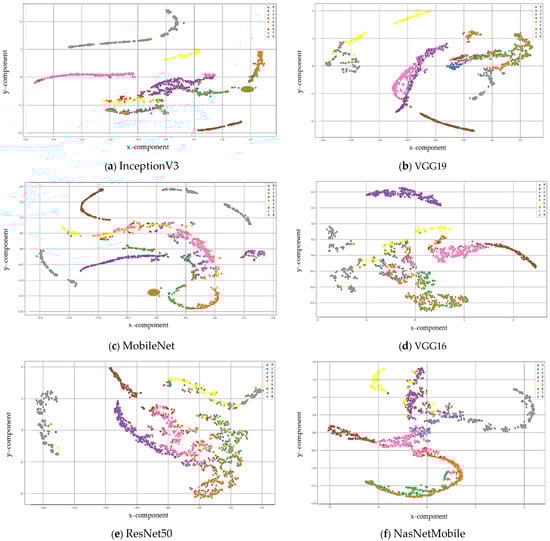 To investigate the performance of the six feature extraction methods after applying transfer feature learning (L, n) and an adaptive learning rate, the t-SNE method was used to visualize the feature maps. Figure 3 presents the maps of the features. The maps in Figure 3a–c indicate that classes were almost separable in the two-dimensional space as compared to other methods. The results suggest that the features extracted using Inception V3, VGG19, and MobileNet were more discriminative than other models. Hence, these three models were selected for fusion and inference to generate the final output.
