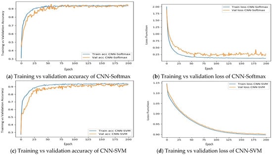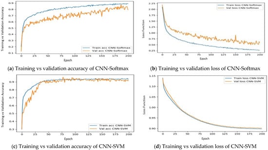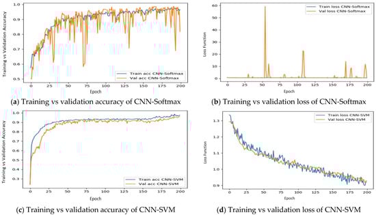 To examine whether the model was overfitting or not, we plotted accuracy and loss function (training and validation) graphs. Figure 4, Figure 5 and Figure 6 demonstrate the training accuracy and loss function during the training process for the three standard well-known transfer learning models using CNN-Softmax and CNN-SVM. It is shown that, initially, the accuracy was low; however, the accuracy gradually increased and finally reached 99% in the training samples for most cases. Moreover, the loss function also gradually decreased. Furthermore, it can be seen from the graphs that, during the training process, the training and validation accuracy was almost similar and increased gradually with the number of epochs. The same decreasing trend was followed by the loss function. In these graphs, it can be observed that CNN-Softmax performed better than CNN-SVM. In addition, Inception V3 performed better than the other CNNs.