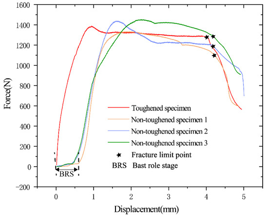 In the initial 0~0.5 mm stage of the curve, the slope of the curve of the specimens without the phloem removed was small and the elastic effect was not obvious, so it can be presumed that the influence of the phloem on the compression of the green pepper branch is small at the time of the initial contact. The elastic modulus of the phloem is equivalent to a buffer cushion, which makes the lower pressure at this stage very little, this stage accounts for about 12.5% of the total compression stage. More importantly, the final fracture location was not significantly changed by the fracture limit force, and the weighted influence of the phloem accounted for 1.18% of the overall mechanical performance of the green pepper branches, which did not affect the damage performance.
