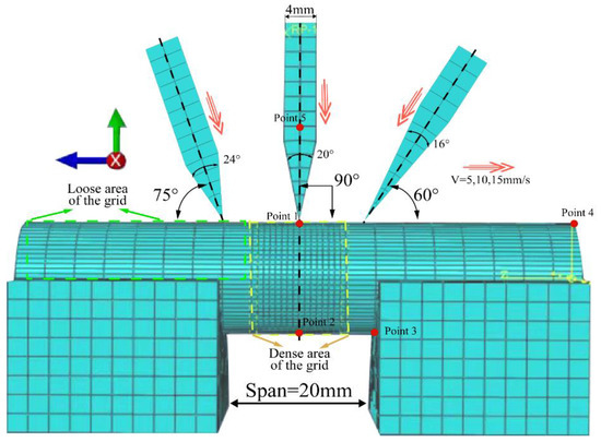 According to the previous simulation results, the incremental step time is of the order of 10−7, which can maintain the analytical convergence and the pseudo-strain energy is around 2%, which meets the energy balance requirement. In addition, for the region of no concern, the model-partitioning method can be used to slice it out, and this part of the mesh division is sparse in order to speed up the calculation time. The mesh division and assembly structure are shown in Figure 2.