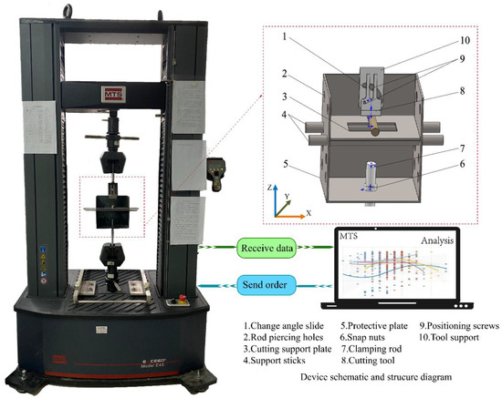 In this study, the cutting force of green pepper branches was measured using an MTS universal material testing machine (model: MTS, E43.50) equipped with a load cell with a capacity of 30,000 N, a data acquisition system with an accuracy of ±1 N, and a sampling interval of 10 Hz to 500 Hz. As shown in Figure 3, a shearing device with protective support was constructed. The support part of the device was supported by a steel rod, one end of which was clamped by a tensile machine vise, and the other end passed through the lower part of the support cover, which was clamped by two nuts so that it would not shake. The support hood is left with some holes, and different cutting angles can be achieved by two support rods penetrating different holes. The branch-placing plate is opened with a slot of 20 × 70 mm, the branch is placed across the slot on the plate, the fixture on the tensile machine is pressed down, and the tool cuts into the specimen and passes through the slot to avoid the tensile machine being stuck and stopped, causing burnout. A tool holder is clamped on the tensioner and can hold tools with different edge angles through positioning holes.