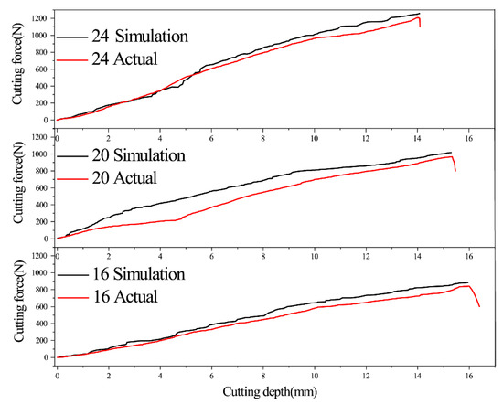 The maximum cutting force is an important index to evaluate mechanical efficiency, therefore we used the method of comparing the cutting process to verify the model accuracy. Table 3 shows the comparison of the maximum cutting force between the simulation prediction results and the actual test results. Figure 4 shows the comparison graph of the displacement force curve between the simulation results and the actual results. From the table, we can see that the maximum cutting force maximum errors are 4.59%, 4.78%, and 3.86%, which satisfy the test error control.
