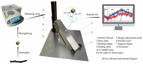 The determination of the coefficient of friction has been extensively studied by previous authors [36,37], and in this study, the static friction coefficient between the branches of P. glauca and the steel plate was determined using the principle of statics. As shown in Figure 5, prepared square specimens were taken, and each side of the specimen was flattened to make the cross-sectional area as large as possible when sliding. Our friction coefficient determination was used for the tool cutting force analysis. In order to be as close as possible to the situation at the time of cutting, the green pepper branch sample plane with the tool cut out was used with no additional processing. Using an electronic balance to weigh the sample, weighing it 10 times to obtain the average value of 270.04 mg, recorded as m. Without replacing the sample, the sample was placed on the friction coefficient ramp meter, the ramp meter ramp material was 45 Cr, the ramp adjustment knob was slowly turned to increase the tilt angle. Then the sample of green pepper branches travelled along the ramp at a uniform speed and the knob stopped turning. The value of the goniometer at this time was then recorded. The value is the green pepper branches. For the above operation, 10 sets of repeated tests were conducted for each of the samples, transverse and longitudinal. The transverse friction angle θ1 was 34.06° and the longitudinal friction angle θ2 was 35.95°, and the friction coefficient was calculated by Equation (11).