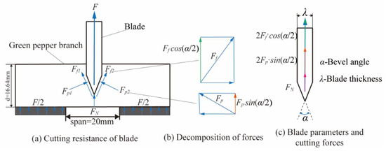 At this stage, there are fewer harvesting devices for pepper, and there is still a gap in the field of green pepper harvesting [11]. Given the above, combined with the research methods of related scholars for other crops [32], and the basis of our team’s research on green pepper [33], the authors established a finite element model of green pepper branch cutting based on the response surface (RSM) optimization method to obtain the optimal parameters in the standard range of 16°, 73.23°, 5.01 mm·s−1. The optimal parameters were then used to perform theoretical and quantitative analyses of the state variables in the cutting process, etc., to establish relevant state models and obtain state parameters to explore the internal and external factors affecting cutting quality, adaptability, and feasibility. Therefore, the overall purpose of this study is to provide a theoretical basis and verification of the feasibility of the design of the branch-cutting type green pepper harvesting device.