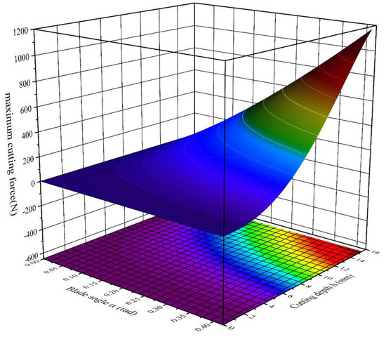 Ideally, the tool edge has no area, but we cannot reach this state, so we used an edge reaction force FN. Since process, material, and time are harder factors to control, each tool edge area is different, and it cannot be used as an indicator when machining a tool, we treat it as a constant, C, and analyze the mechanical cutting mechanism and the trend of change under controlled conditions, as well as the influence it is subjected to. The final response image of the modeling is shown in Figure 7. It shows that the edge angle and depth of cut have a great impact on the cutting force, with the increase in depth, friction, and elasticity, which combined to form the growth of the reaction force. The proportion of each part of the process is determined by the edge angle, but in most cases the reaction force dominates the proportion.