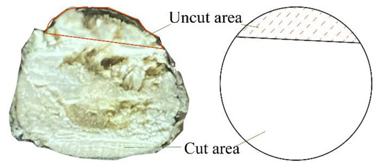 After several pre-experiments, as well as 2.5 tool force theory analysis, it was determined that the tool edge angle, feed speed, and feed angle were important factors affecting the shear resistance of branches. The key factors of green pepper cutting and harvesting were maximum cutting force and cutting quality. The cutting quality includes evaluation indexes such as cutting completion degree and damage to branches, etc. According to the actual impact, this study focuses on the cutting completion degree. The cutting completion degree is obtained through the cutting force trajectory. The tool displacement at the end of the cutting force is obtained by examining the transverse coordinate of the cutting force end section and comparing it with the ideal cutting displacement, which is the cutting completion degree, as shown in Figure 8. In order to reduce the maximum cutting force and improve the cutting completion, the structural parameters and operational parameters of the pepper harvesting tool were optimized. A single-factor preliminary selection test was designed with the goal of minimizing the maximum cutting force and maximizing the cutting finish.