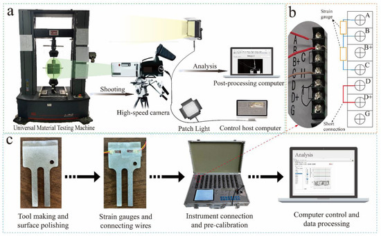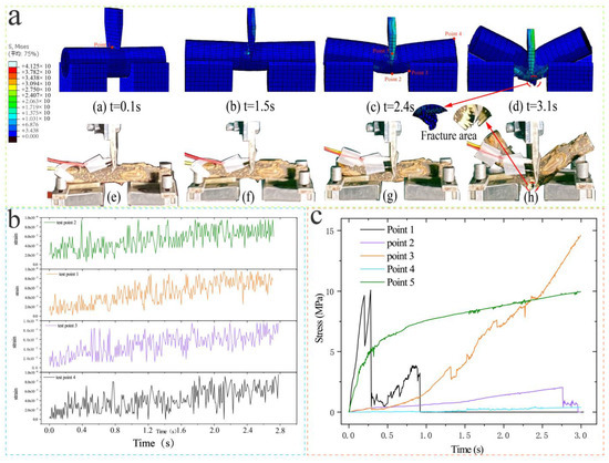Cutting monitoring comparison model. (a) Comparison of span cut simulation and actual different time node patterns. (b) Strain changes in the tool during cutting. (c) The process of stress change in several key nodes during cutting.