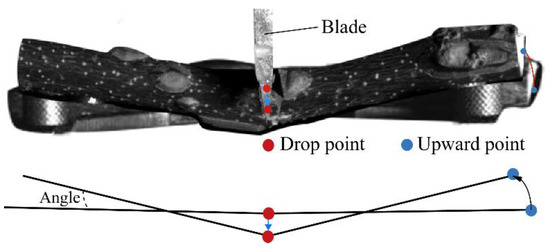 From the previous simulation tests and compression tests, it can be seen that the green pepper branches, in the process of cutting across the distance, will lead to a single point compression deformation of the green pepper branches as shown in Figure 11. That is to say, the reference compression point in the middle of the branch decreases, and the two ends of the branch, due to the V deformation, produce a reference point with an arc rise.