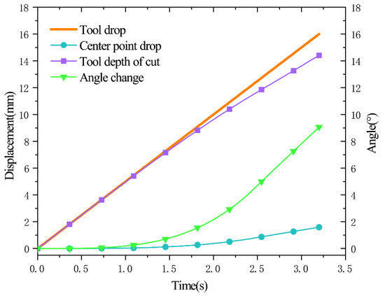 The images were extracted under the conditions of an optimal speed of 5.01 mm·s−1 with a blade angle of 16°. The images were taken by a high-speed camera and processed using Image-J (National Institutes of Health) software to extract the falling distance of the central compression reference point every 0.05 s. The rising distance and lateral distance of the rising reference point at both ends, the deformation angle of the green pepper branches β, and the related data were processed and plotted as shown in Figure 12.