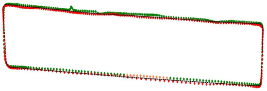 The positioning data under the two modes of on and off of the integrated navigation were collected in the experiment, and the trajectory comparison results generated through data processing were shown in Figure 7. The black dashed line in the figure is the preset track route, and the green track line is the one measured when the integrated navigation mode was off. Some of the line segments are in yellow, which means that the satellite signals were poor and the position calculation results were inaccurate. The red track line is measured when the integrated navigation system was on with no inaccurate solution results, and is closer to the black reference line. The integrated navigation system test route is displayed on Google Maps through data processing, as shown in Figure 8.