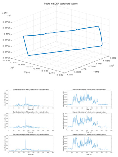 This experiment mainly deals with the positioning data of integrated navigation. In the ECEF (Earth-Centered Earth-Fixed) coordinate system, the z-axis and the Earth axis point parallel to the North Pole, the x-axis points to the intersection of the prime meridian and the equator, and the y-axis is perpendicular to the xOz plane (the intersection of East longitude 90 degrees and the equator). The position and velocity standard deviation on x-, y-, and z-axes can be obtained, as shown in Figure 9.