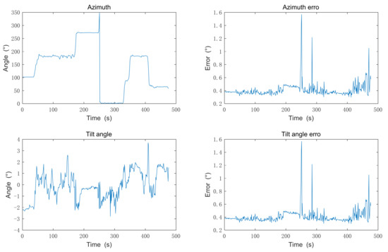 The data of azimuth angle and inclination angle are shown in Figure 10. The azimuth error during the most driving time in the figure is within 0.6°, with a large error of a few seconds, but remains within 1.6°; the deviation of inclination angle is within 1.4°, and remains within 1° most of the time. For some large errors, actual driving conditions are considered. For example, the 1.6° azimuth error because of the 350° sharp drop at the 250 s is considered as resulted from the large vehicle turning amplitude.