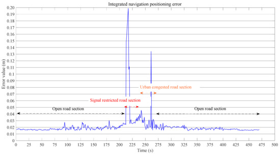 The integrated navigation system of agricultural machinery based on RTK-BDS/INS integrates RTK-BDS positioning data and IMU data to finally calculate the integrated navigation positioning error, as shown in Figure 11. The error is within 3 cm in the open road section of grassland with good satellite and radio signals, and no interference from tall obstacles. On the road sections with obscured signals and traffic congestion, satellite and radio signals will be interfered, and the errors will fluctuate greatly but within the allowable range. Moreover, the integrated navigation system has strong adaptive anti-interference ability, which can quickly correct the position information and reduce the error. Compared with previous research results, for example, in the tractor experiment in Literature 9, the lateral deviation of the integrated navigation system could only be kept within 10 cm at the speed of 3.33 m/s; the navigation system designed in Literature 25 could achieve an error within 6 cm when traveling at the speed of 1.5 m/s; the error of the autonomous navigation system designed in literature 23 could be controlled within the range of about 4 cm, but only at a speed of 0.3 m/s, the integrated navigation system designed in this paper is advantageous in following aspects: (1) the positioning accuracy can still be guaranteed at higher speeds without increase of error; (2) the mutual assistance of RTK-BDS and INS solves not only the problem that BDS signal may be interfered with transient loss of lock, but also the problem that error in single inertial navigation system will increase with time; using radio station to realize RTK technology avoids the high costs of network accounts purchase in the past, which is more in line with the actual needs of China.