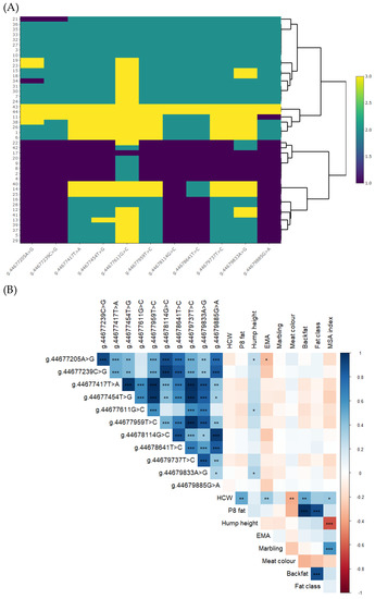 the alternative homozygotes. (B) Correlations between genes SNP and carcass traits. * p < 0.05, ** p < 0.01, and *** p < 0.001.