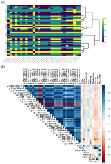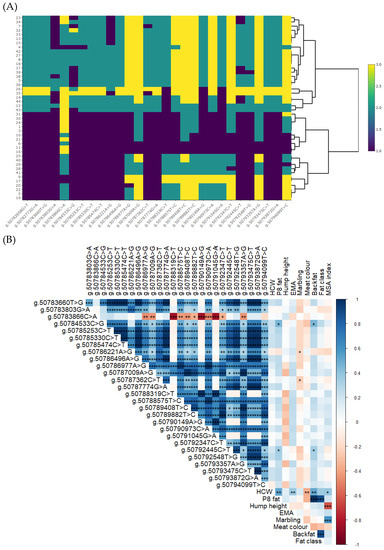 the alternative homozygotes. (B) Correlations between SNP and carcass traits. * p < 0.05, ** p < 0.01, and *** p < 0.001.