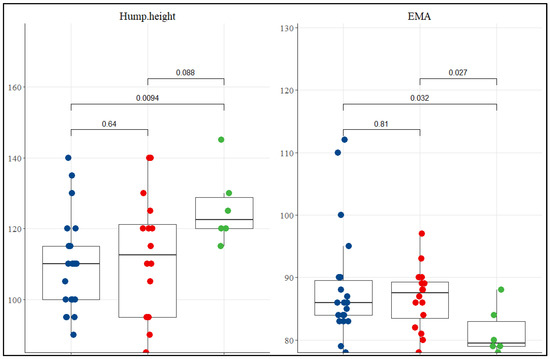 Multiple comparisons of hump height and loin eye muscle area (EMA) for FABP4 g.44677205A>G genotypic variants AA (