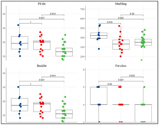 Multiple comparisons of P8 fat, marbling, backfat, and fat class of SCD g.21275851C>A genotypic variants CC (