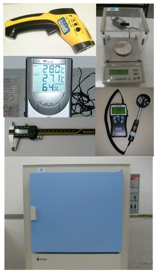 Equipment used in drying experiments: infrared thermometer, balance; thermohydrometer, anemometer, caliper and oven.