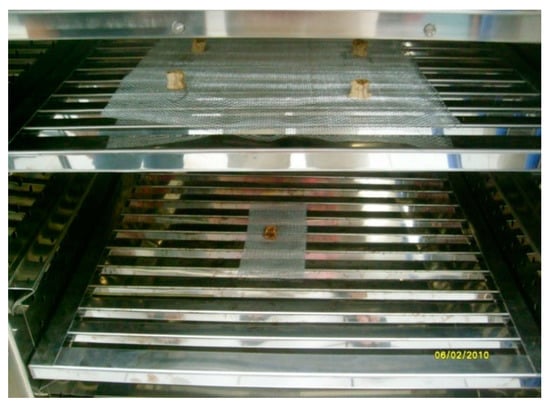 The arrangement of the samples in the oven was performed in the following way: a pilot sample placed on a small wire mesh screen and six samples on a large wire mesh screen with identified places for each sample. In the first 40 min, with an interval of 5 min, from 40 min up to 120 min with an interval of 10 min, from 120 min up to 390 min with an interval of 30 min, and from 390 min up to the final of the process with an interval of 60 min, the parameters dimensions, mass and temperature were measured only for the pilot sample. At the end of each drying time interval (40, 120, 390 and at the end of the drying), temperature, mass and dimensions were measured in each sample. Experiments were carried out without repetition.