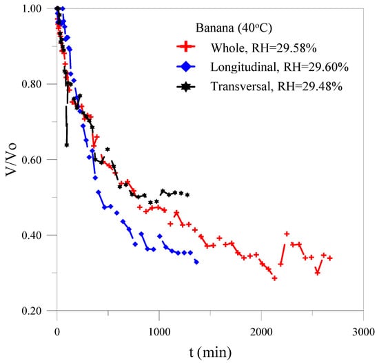 Ratio between measured and initial volume of banana samples as a function of time during drying at 40 °C.
